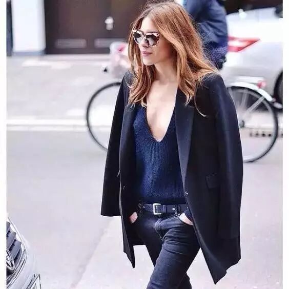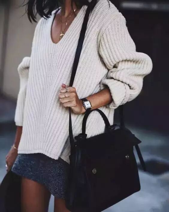 这样的搭配欧美博主也是敲爱,选择宽松一点的V领毛衣和超短裙搭配,更时尚显瘦,并不需要刻意强调腰部曲线。
