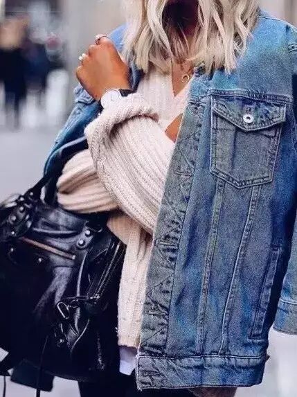 换上年年都特别火热的牛仔外套,就很街头风,不过辣种比较粗大线条的V领针织作为内搭愈加潮流时尚。