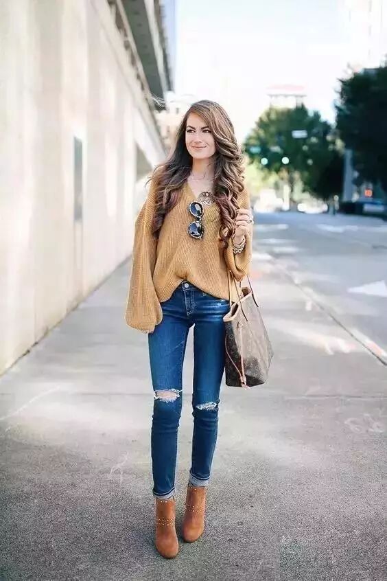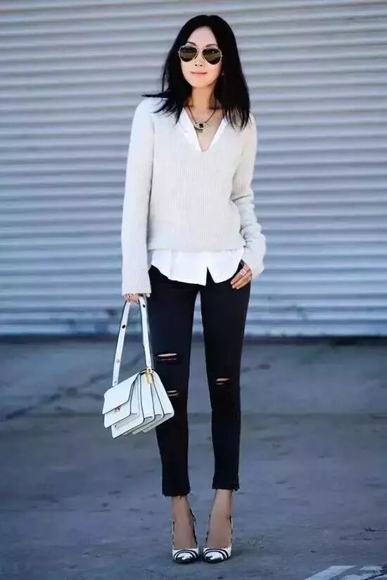 对自己腿型满意的,可以尝试搭配酷酷的紧身破洞牛仔,把宽松的V领针织衫塞进裤子,拉长腿部比例,就很时髦街头风。