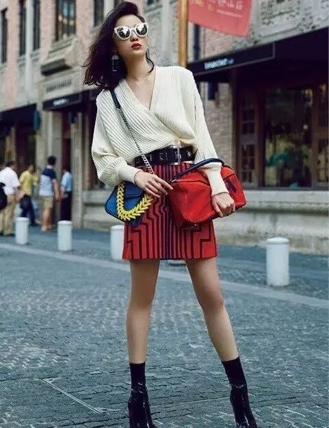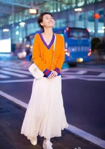 偶尔来点小清新,像马思纯艳色的V领针织搭配纯白的雪纺裙,飘飘欲仙的少女感max~