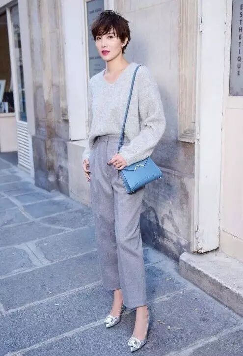 小宋佳这样搭配材质比较硬的阔腿裤,通勤干练,可以学学这样同色系的搭配,优雅显气质,很适合上班穿。