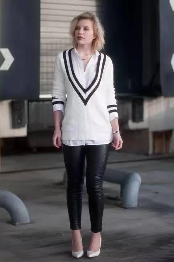V领针织能与各种外套完美混搭,薄款的V领针织外搭厚皮夹克,外刚内柔,帅气与性感并存,披着穿有种不羁少女的霸道气息,rock~