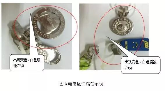 本次比较试验中有42款书包样品按标准要求测试了电镀配件耐腐蚀性。电镀配件的耐腐蚀性是用等级来表示,等级越高,其抗腐蚀性能越好。经测试,在标称执行标准为QB/T2858-2007的42款书包中,约三成书包样品的耐腐蚀性能与标准值存在差异。图3是电镀配件腐蚀示例。
