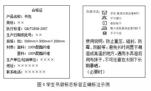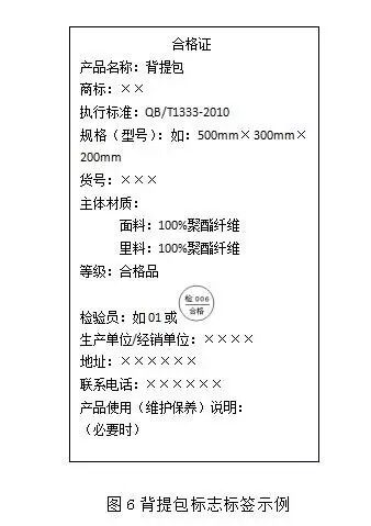 作为产品质量的一部分,标志、标签是引导消费者购买商品的重要参照因素之一。正确完善的标志可以帮助消费者做出正确的选择,反之则会对消费者造成误导,使消费者在购买产品时不能明确识别产品的基本信息与优劣程度。本次比较试验的70款样品中,有17款样品的标志标注不完善,出现未标注生产日期及批号、执行标准编号、生产单位地址、联系电话、货号、规格(型号)、等级、货号、主体材质(面料、里料)等情况。图5为学生书袋标志标签正确标注示例,图6为背提包正确标注标志标签示例。