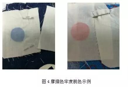 摩擦色牢度是考核书包在使用过程中,与接触的人体及衣物发生摩擦后是否会发生颜色变化的重要指标,也是消费者比较在意的项目,摩擦色牢度达不到标准要求,书包产品就会非常容易脱色,在使用过程中会把颜色转移到衣服上,既影响美观又影响使用。经测试,在标称执行标准为QB/T2858-2007的42款书包中,有5款样品的摩擦色牢度脱色较严重。图4是摩擦色牢度脱色示例。