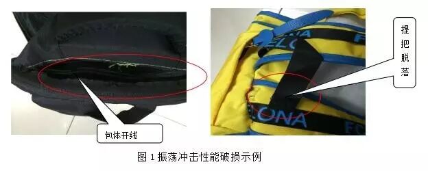 该项目主要是通过模拟实际使用过程中书包各部件经受振荡冲击作用后能否保持其正常使用性能的重要考核指标。图1和图2为振荡冲击性能破损示例。