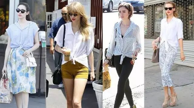想要衬衫穿的有feel,可以把前面的衣角扎起打上漂亮的结,,这样既修饰腰身,又能拉长腿部线条↓ ↓ ↓