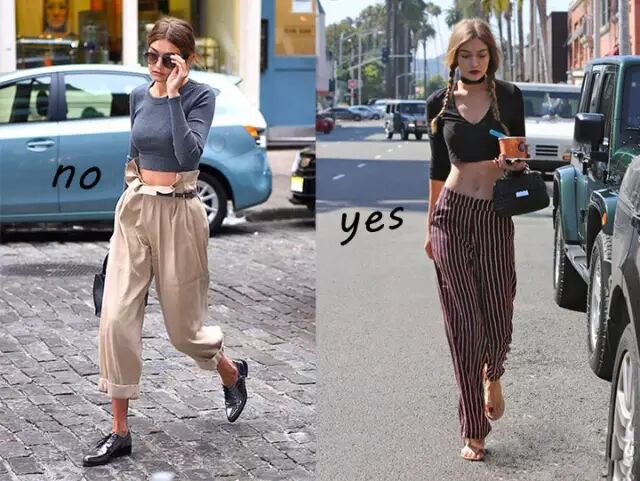看~同样是Gigi Hadid,但她分别穿着深、浅色系阔腿裤,身材的视觉效果宝宝们了解了吧~?