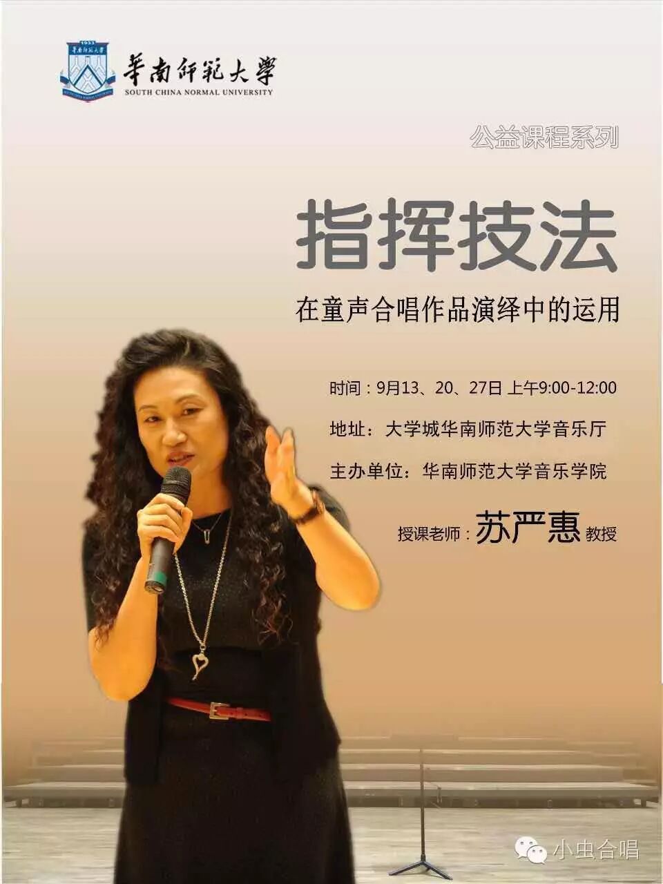 先公布一条好消息:为满足更多中小学音乐老师及合唱教育界人士观摩学习苏严惠老师的公开课——《指挥技法在童声合唱作品演绎中的运用》,经向音乐学院申请批准,本周二(9月20日)及下周二(9月27日)的公开课将改在华南师范大学音乐厅举行,上课时间不变,仍旧是上午9:00-12:00,请各位计划来听课的老师和同学们互相知会。