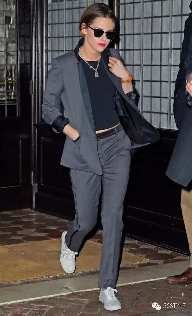 越来越Man的暮光女小K私下也几乎都是裤装出门,近来她也开始爱上西裤+球鞋的穿法,简直帅到不行!