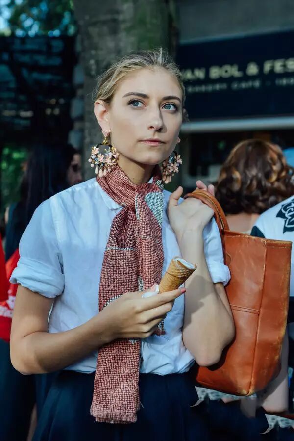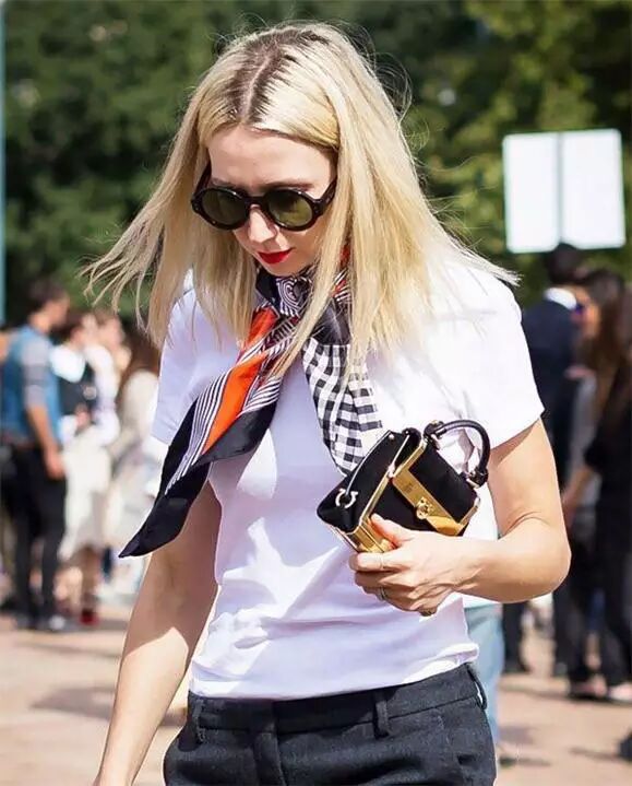 围巾+T恤:微凉的天气可以加上一条羊毛围巾增加温度。天气好的日子里换成丝巾,顺滑的质感和斑斓的图案能瞬间提升气质。