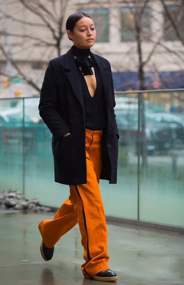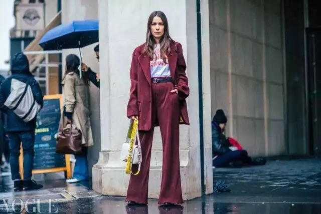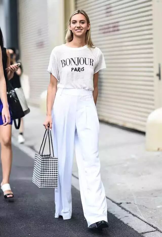 阔腿裤+T恤:随着阔腿裤的大热,每个人的衣橱里应该都有一条了吧?与T恤搭配起来也是非常随意。七分或者九分的阔腿裤里只要穿条筒袜就可以了