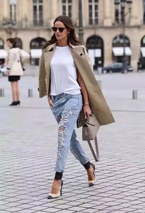风衣+T恤:今年比较流行的长款风衣,挺阔有型或是垂感较好的风衣都很赞,出街能让你自带气场,内搭T恤也毫不逊色