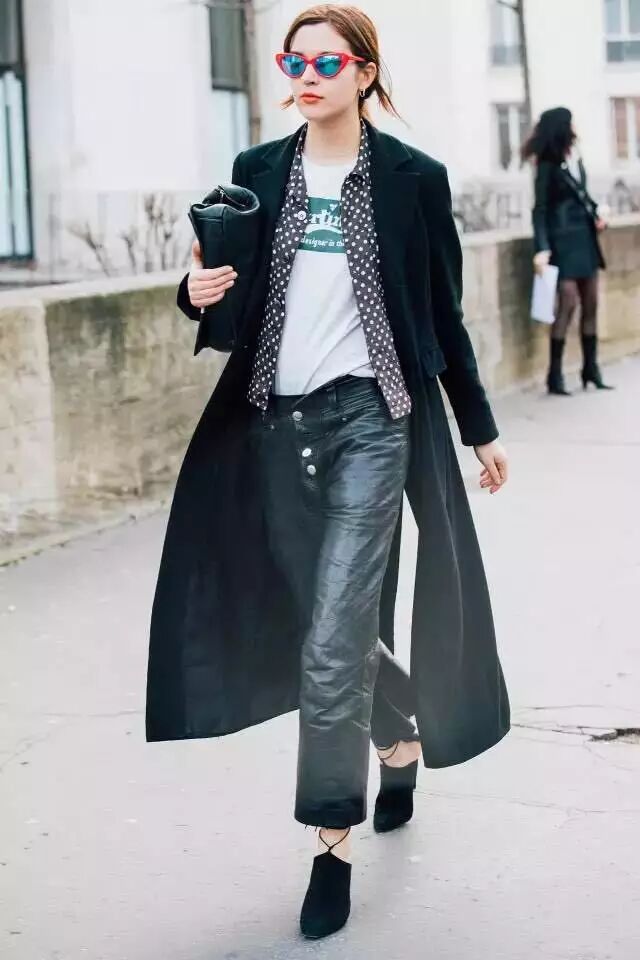 皮衣+T恤:每个人的衣柜里肯定有一件帅气的皮衣,要穿出酷酷的感觉,最简单的穿法就是T恤+长裤