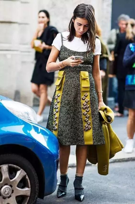 连衣裙+T恤:夏天的吊带裙现在就可以拿出来了!材质轻薄的连衣裙走路带风的样子会让你的回头率超高!