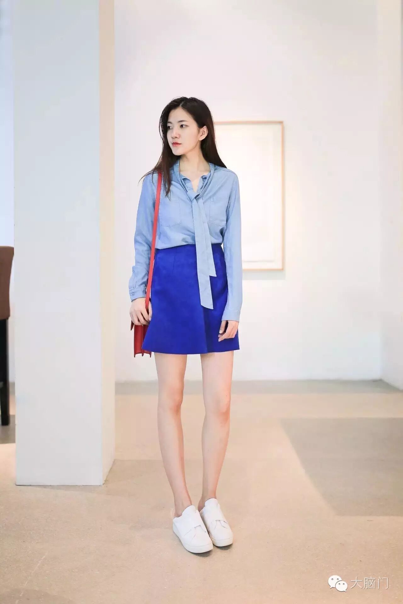 Sunnie(微博ID: SunnieLovesFashion)就有搭过一套All Blue,典型的OL单品,衬衣+A字半裙,但衬衫的飘带设计,和半裙的麂皮面料,立马提升了时尚感。