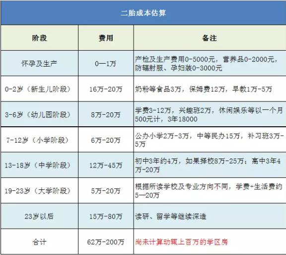 二孩的最大困难是经济压力,养两个孩子成本太高,一个家庭难以承担。看看下面这个”抚养一个孩子的账本“可能许多想生二孩的年轻人都会望而却步了。(以广州花都区一对中产阶级家庭夫妇为例)