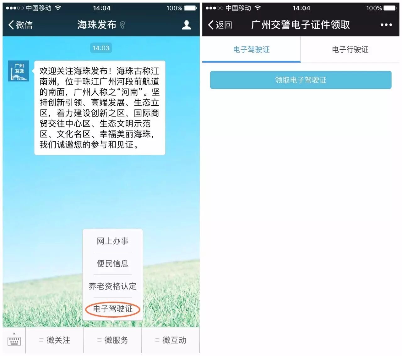 2、在“海珠发布”微信号下拉菜单中点击【微服务】—【电子驾驶证】即可进入广州交警电子证件领取页面。如图示↓↓↓