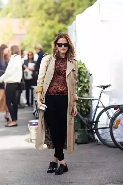 长款风衣+蕾丝内搭+黑色修身裤+乐福鞋,把帅气和娘炮完美结合,超级时髦~▼