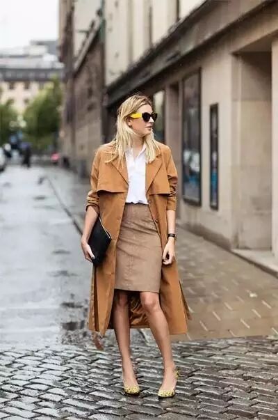 长款风衣+白衬衣+包臀裙,这个style很适合OL们。▼