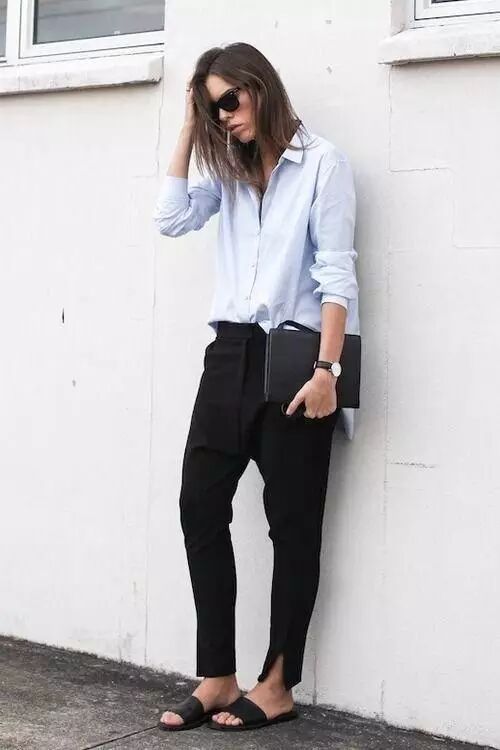再万能的鞋,碰到正装,总该歇了吧……并不!任性的人任性起来是永无止境的!即使是碰到正装,依然能看到小丑鞋的身影!下面这套衬衫黑裤配小丑鞋,慵懒性感上班族。