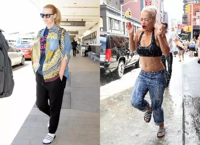 近几年力压“人字拖”风头的——“一字拖”or“澡堂拖”,瑞塔·奥拉、阿米莉亚·凯利都是它的忠实粉丝。