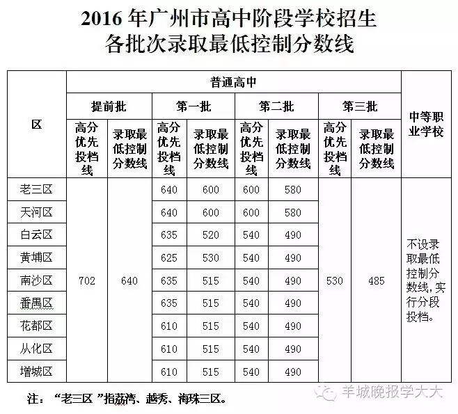 第二批老三区和天河区的高分优先投档线设为600分,其他区为540分,第三批高分优先投档线为530分,均与去年相同。