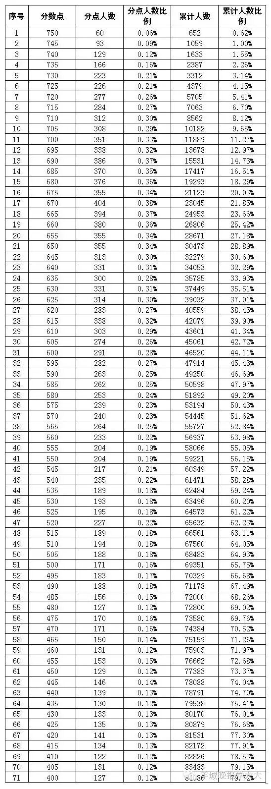 据介绍,今年广州中考总分全市平均分为539.58分(不含政策性加分,下同),比去年提高了7.10分。高分段考生比例比去年略有降低,全市750分以上考生有652人,占比0.62%,比去年降低了0.18个百分点;700分以上考生有11889人,占比11.27%,比去年降低了1.02个百分点。中分段考生比例比去年略有提高,全市600分以上考生46520人,占比44.11%,比去年提高了0.37个百分点;485分以上考生72000人,占比68.26%,比去年提高了2.63个百分点。