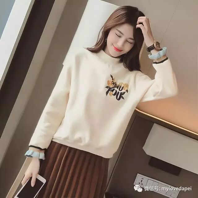 很舒适的面料,亲肤性佳,厚度适中。宽松基础版型,百搭不挑人,半高领设计,呵护颈部,防风保暖,围巾都免了~胸前的花朵和字母刺绣,很精致唯美!袖子拼接针织撞色花瓣袖,俏皮甜美,更显纤纤玉手。这样好看的一件卫衣,喜欢的就不要错过啦