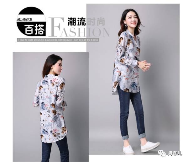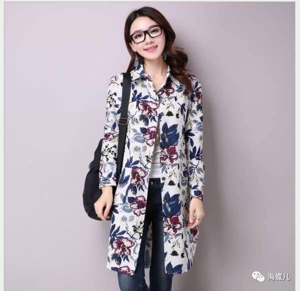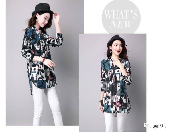 时尚套装搭配示范分享NO15:中长款显瘦翻领印花单排多扣衬衫