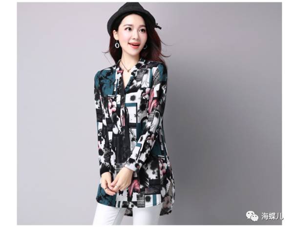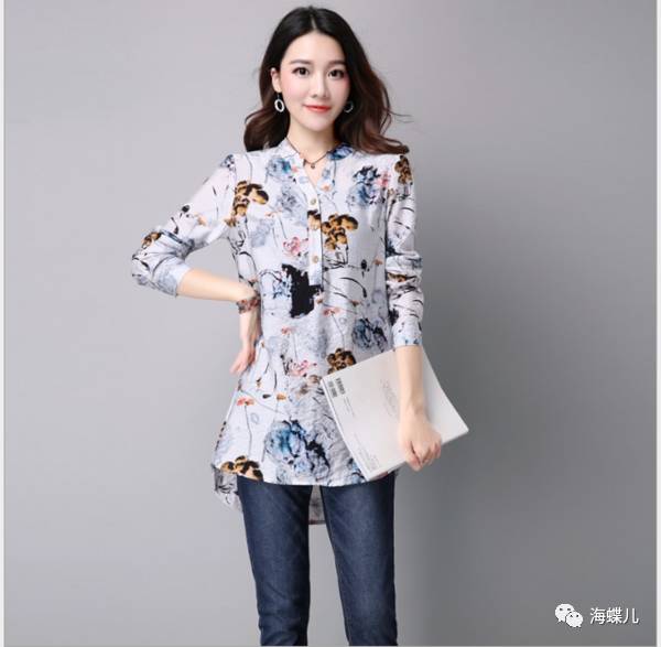 时尚套装搭配示范分享NO20:长袖印花2017年春季中长款衬衫