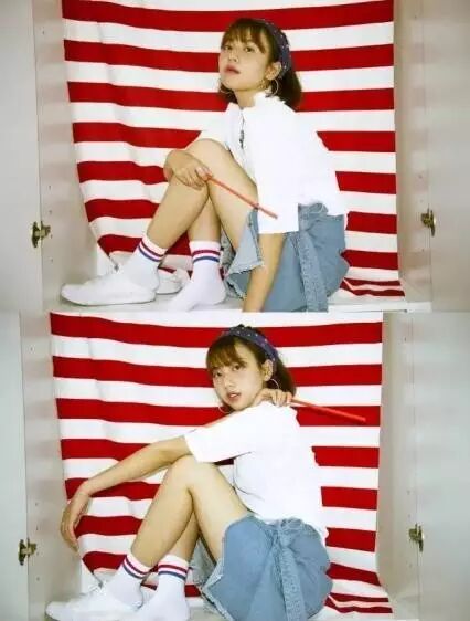 坐在马桶上,拍摄角度从上往下拍。后面也是挂上条布,不仅把卫生间乱七八糟的瓶瓶罐罐遮住,还能让照片的重点放在你身上。