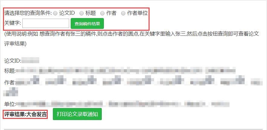 进入大会官方网站 (从分会网站 www.csobmr.org.cn 的学术会议板块中进入会议网站),点击【论文评审结果查询】按钮,见下图示;