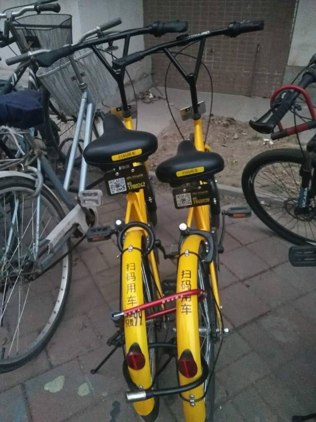在宿舍楼下发现的小黄,两辆车子被紧紧锁在了一起 。