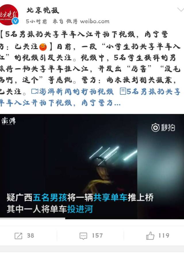 如果说小学生将单车投进河是因为年幼无知、缺乏教育、不懂事,而广州这两位成年男子如此行为不禁令人汗颜。