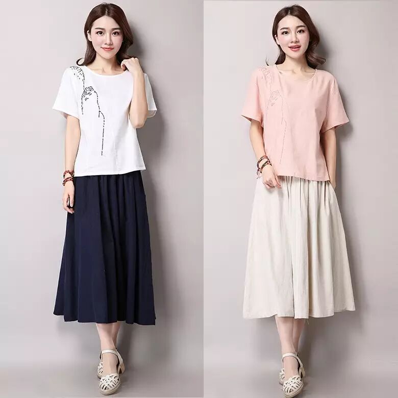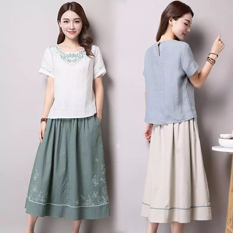 TOP8:文艺淑女短袖圆领印花小衫搭配高腰长款印花A字裙,素雅的小印花,优质的棉麻面料,清爽透气,不挑身材,适合各种身形。