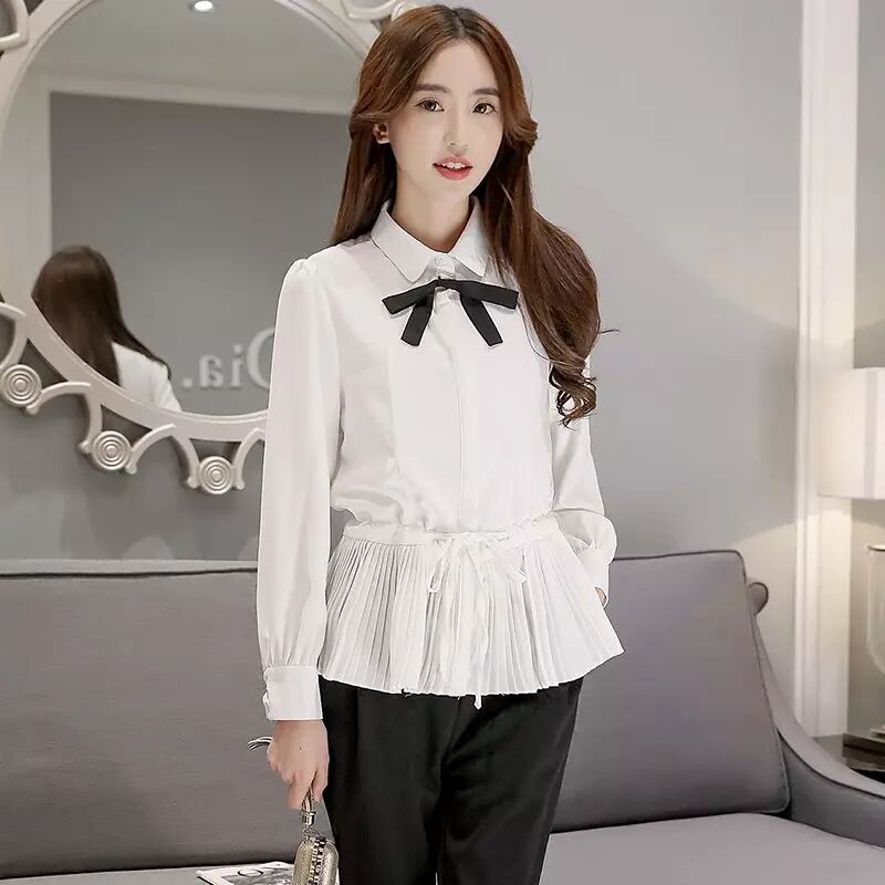 TOP22:纯色淑女范长袖单排扣白衬衫,领口黑色飘带增加淑女气息,使整个衣身活泼有朝气,衣身下摆也增加设计亮点,让你可爱招人怜爱。