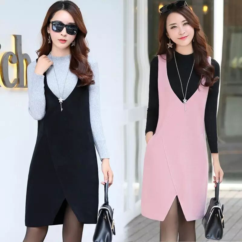 TOP1:简约时尚纯色背带裙套装,内搭黑色的毛衣,温暖的同时产生一定的对比度,韩版风格的背带下微露一个小开衩,给整个衣身带来新颖感。