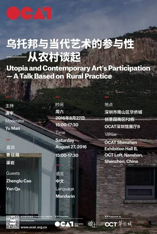 乌托邦在词源上是指不存在但完美、理想的地方,而朝向乌托邦的冲动,是人在无意识层面的一种结构性欲望。,乌托邦更多是指一种不依托于社会实际的力量,即沉迷在幻想中的,不切实际也无法达成的愿景。由此具体到社会参与性艺术中的乡建,我们该如何去理解和评价?乡建的出现既交替了一种乌托邦式的冲动与对现存发展模式的批判性思考,也蕴涵了一种乡愁式的回归和着力重新发明乡村主体性的实践。但一个不触及根本性的生产与分配关系,及在此基础上生发新的社会构造,这样的实践是否还有现实的意义?在当前的语境中,激进的行动与立足现存条件的改良,谁才是乌托邦呢?或许这样的实践也只体现出伦理和美学的意义——是基于身体感性的启蒙,或是一种关于未来的动员与预演。深圳大学教授,作家。插过队,当过兵,做过工人和机关干部。著有理论专著《新时期小说艺术流变》,文学代表作包括长篇小说《问苍茫》、《民主课》,中篇小说《那儿》、《霓虹》等。曹征路是当今文学创作中“底层叙事”的代表性作家。作为一种创作潮流,有人把“底层叙事”看作对左翼文学和现实主义文学传统的复归,借此显示文学史的延续,也试图建立历史与现实的联系。当代艺术家。毕业于山西大学,90年代初赴欧洲学习和工作,90年代末回国,2012年被聘为广东工业大学城乡艺术研究所所长、特聘教授、硕士研究生导师,现生活和工作于北京。从上世纪80年代开始积极投入“85新潮”美术运动,作品涵盖绘画、装置、多媒体、摄影和社会行动等。从2007年开启以艺术推动乡村复兴的实践,渠岩延续了上世纪知识分子下乡的传统,长期深入山西太行山的一个古村落“许村”。毕业于广州美术学院油画系,艺术家,策展人和评论家。 北京二楼出版机构发起与负责人之一,曾任西安美术馆副馆长,目前生活工作于北京和广州。