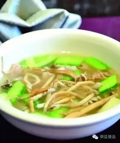 2、在锅里加入二汤1500毫升,下姜花,大火烧沸后下肉片滚至刚熟,再下荔枝菌和丝瓜,滚至刚熟后调入盐、少许油便可。