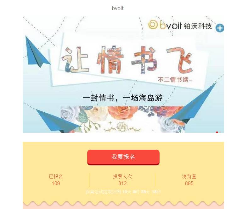 活动介绍:让承载着爱的纸飞机起飞吧!同时还能参加投票活动,精美的礼物伴随着满载爱意的纸飞机一起飞到TA身边吧!快来参加吧!评选规则:根据参赛选手作品的最终票数决定排名,根据排名获得相应的奖品第二步:公众号内回复“情书”,点击图文进入报名详情页第四步:填写信息及作品后点击“确认报名”,即可报名第二步:公众号内回复“情书”,点击图文进入投票详情页第三步:输入选手姓名或编号后,点击搜索,直接进入页面 1.作品内容为各位情书,参赛报名时填写信息必须是真实手机号码。同一个人不可以使用多个微信号重复报名,如发现重复报名,经查证后只保留最好的作品,取票数最高。若出现相同票数时,将按照报名参加的时间先后排序。 3.本活动有防刷票功能,如投票系统后台发现恶意刷票,第一次将予以警告并扣除所刷票数;第二次发现将直接取消参赛资格。4.为保证活动公平,防止作弊,因此投票需要通过公众号进行操作。5.每位微信用户在活动期间有100次投票机会,每天可以给不同的作品分别投一票。6.对成功投票后,取消关注的,被投票选手的票数将自动取消。 7.不得盗用他人作品进行比赛,一经发现取消参赛资格。 8.为确保本次活动的有序进行,报名的选手需审核通过才能参与投票。注:本次活动最终解释权归广州铂沃网络科技有限公司所有中奖名单将于9月30号18:00由广州铂沃网络科技有限公司微信公众平台公布。届时关注微信公众号回复“中奖”即可查询中奖名单。