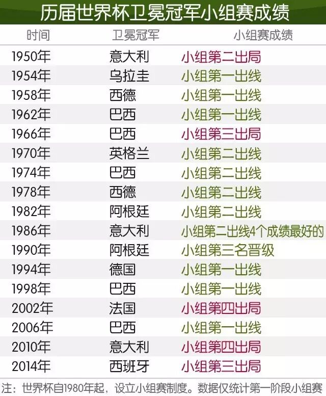 与欧洲杯相比,世界杯就安全得多。自1950年设立小组赛至1998年,13届世界杯只有2次卫冕冠军倒在小组赛(只计算第一阶段小组赛),分别是1950年的意大利和1966年的巴西,正印了“常在河边走,哪有不湿鞋”那句话,这是世界杯冠军拿得最多的两队。