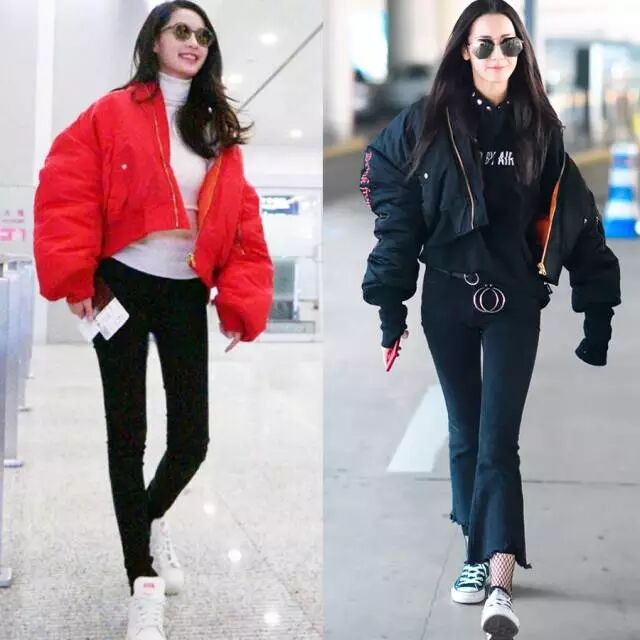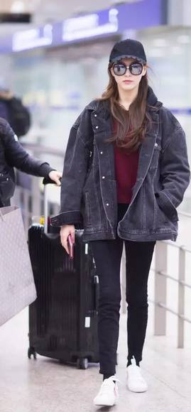 李沁和迪丽热巴则喜欢小一号的外套,配上牛仔裤和运动鞋,走的叛逆少女风。
