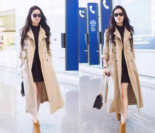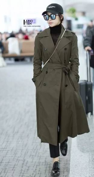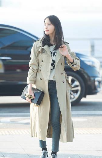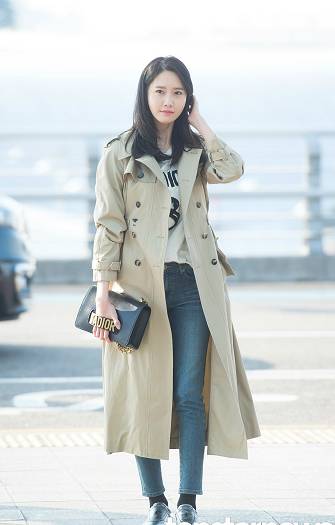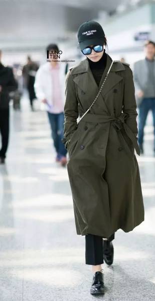 允儿从仁川机场去香港参加时尚活动,她在机场穿了长款风衣。