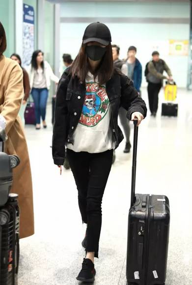杨幂从韩国首尔飞抵北京现身机场,杨幂身穿黑衣黑裤,内搭骷髅图案的白色T恤大秀长腿~