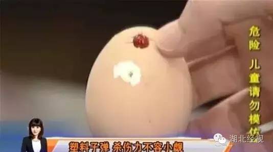 湖北经视《经视一锅鲜》栏目曾做实验:填充了塑料子弹的玩具手枪射穿了四层报纸,玩具竟然穿破了31层报纸,两种枪射出塑料子弹都将熟鸡蛋壳射裂。弹射小石子则能把熟鸡蛋瞬间击穿!