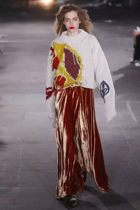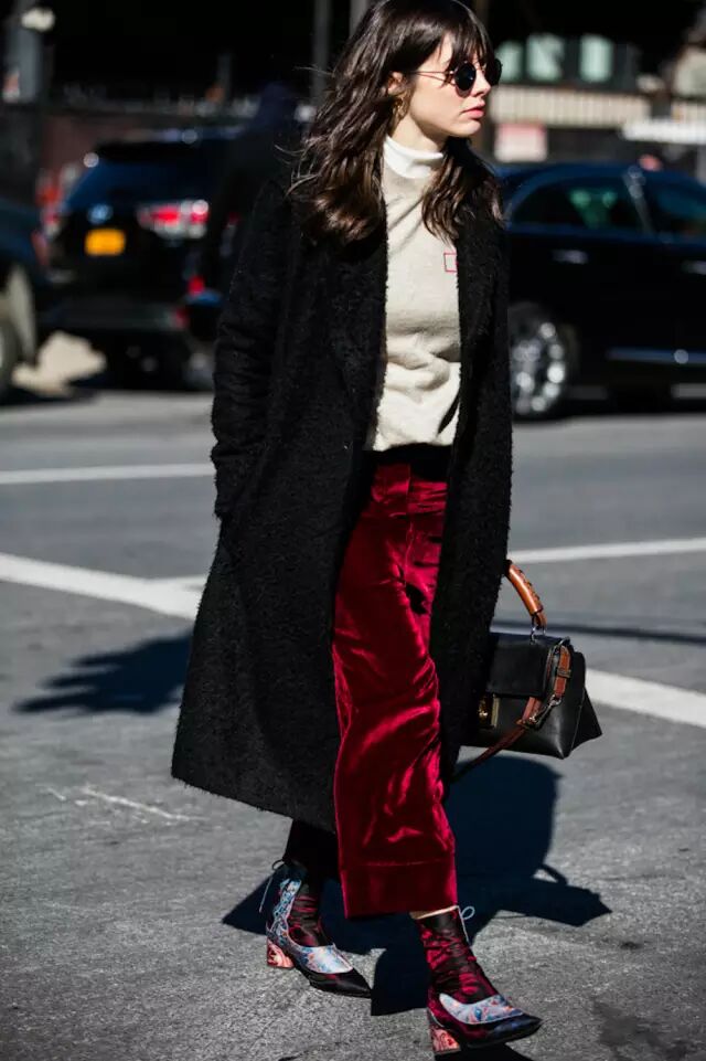大毛衣搭配天鹅绒的西装裤还是不错的,而且比较实穿,西装裤选短一寸的比较好,露出一截脚踝更时髦。