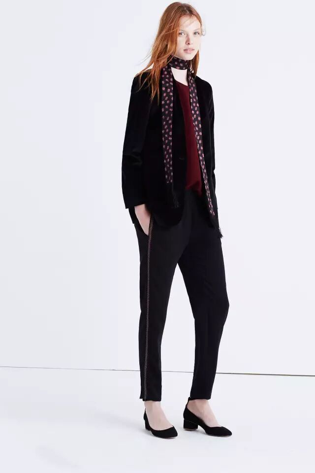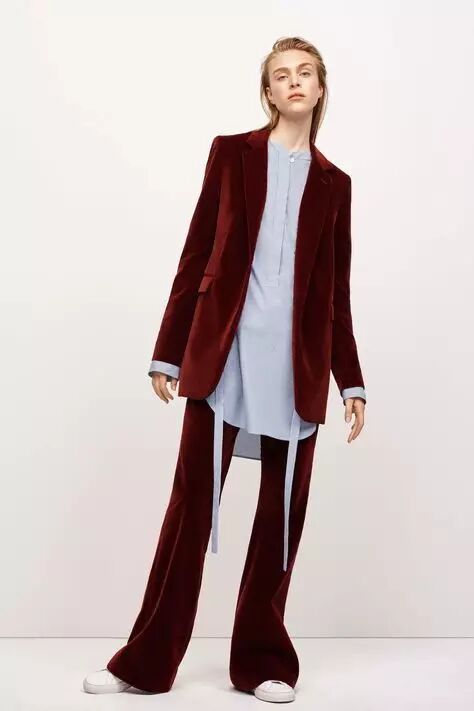 如果把它们分开穿,效果也很好,一套天鹅绒的西装套装可以变化出很多种穿法,符合经济效益的单品。