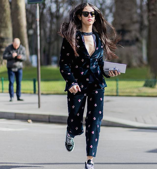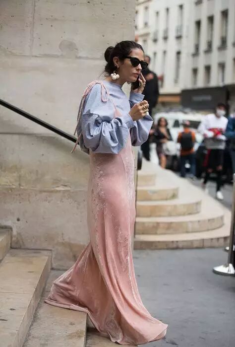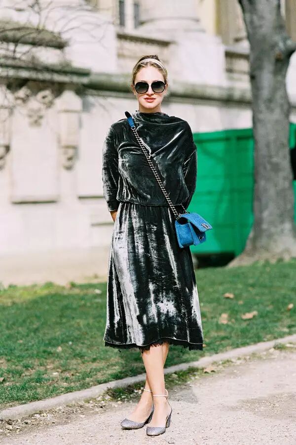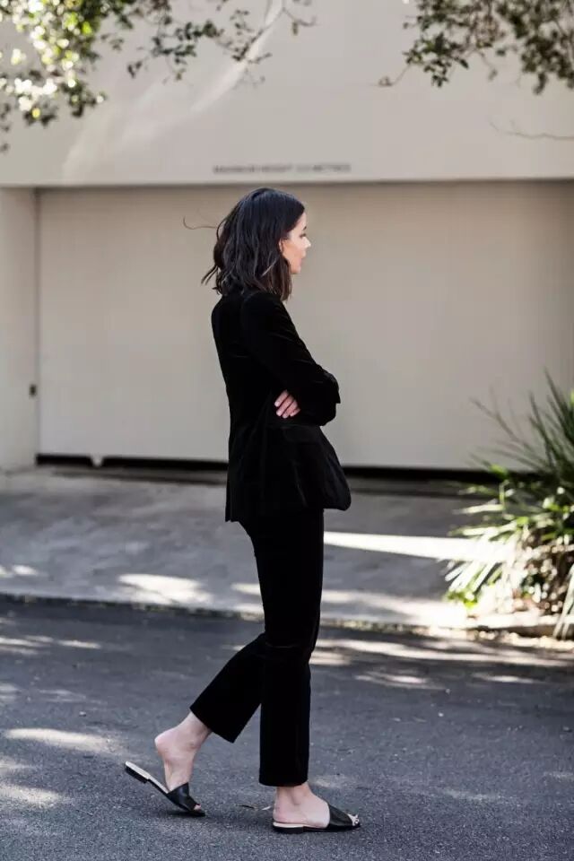 看了这么多街拍图,最受欢迎的三类天鹅绒单品就是suit(有些人也会把它拆分开来穿)、slip dress和连衣裙,看起来最简单的穿法当然就是suit了,不用去想上下搭配什么,选一双合适的鞋就行。slip dress说了很多很多遍了,冬天换了个面料,可以继续穿;至于连衣裙的款式可以根据自己的性格来选择,如果你不怕性感很敢穿的,可以是交叉V,甜美小女生的就是正常的娃娃连衣裙。