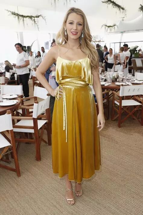 Blake Lively在戛纳电影节上穿的就是Valentino2016秋冬系列天鹅绒的黄色连衣裙。